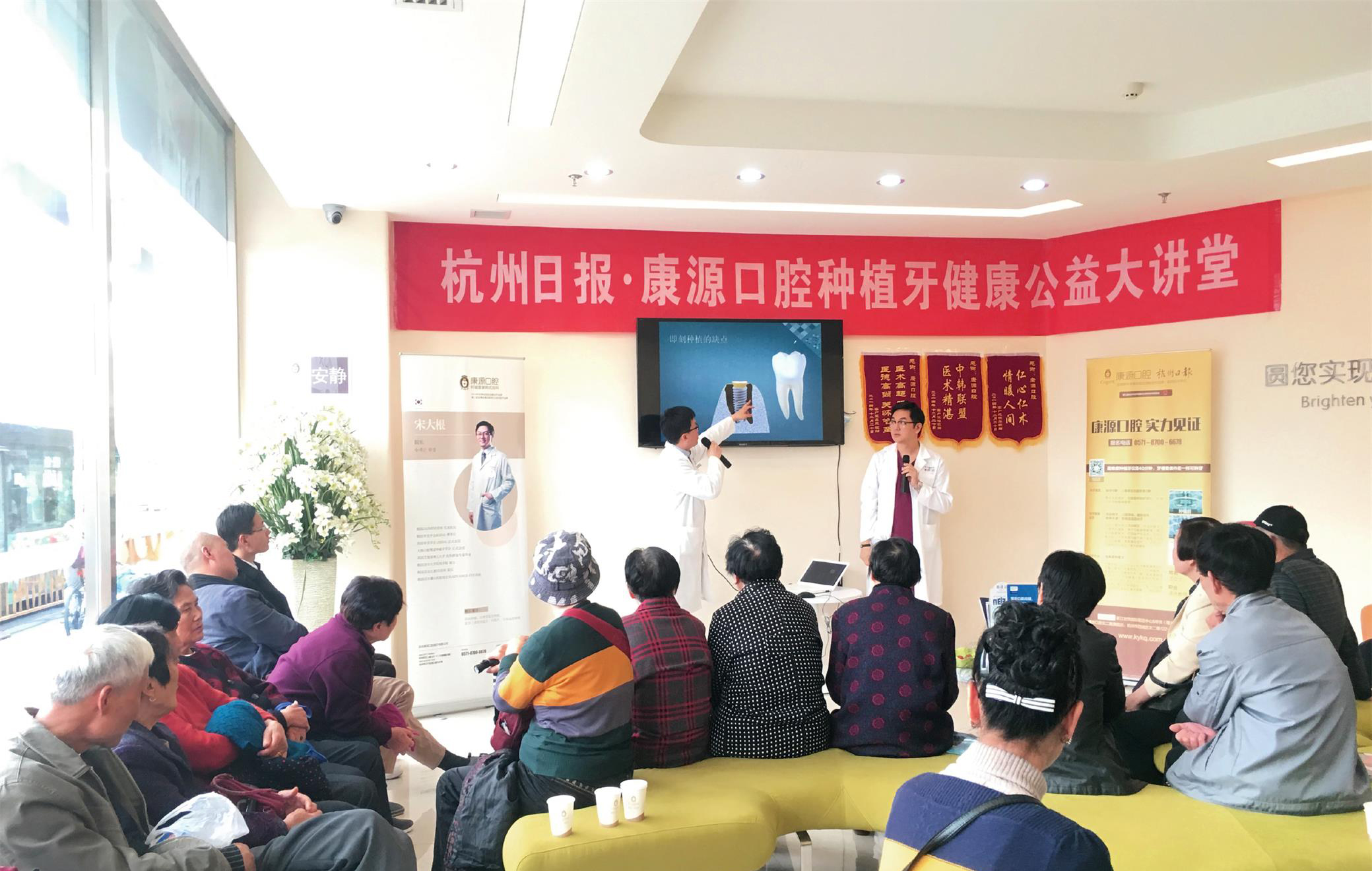 为了让杭州市民牙好体健,开心茶馆联合康源口腔,把韩国种植牙专家请到了家门口,让杭州市民不出国门,也可以开心种牙!